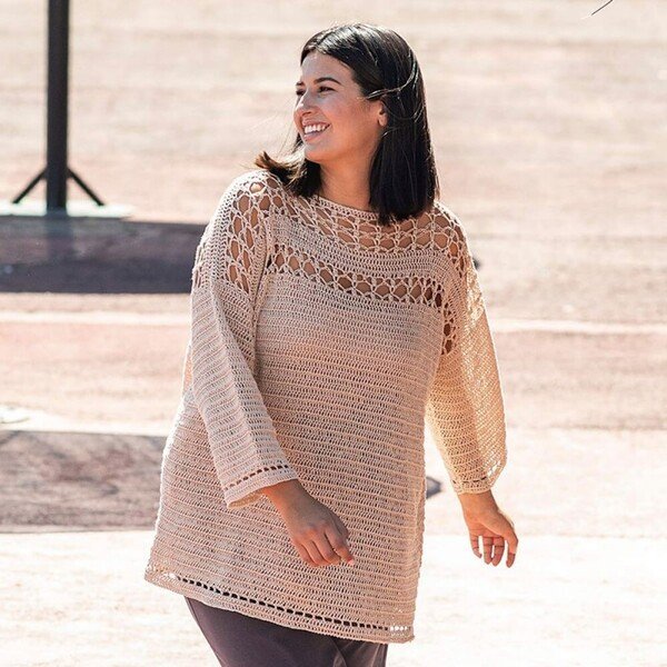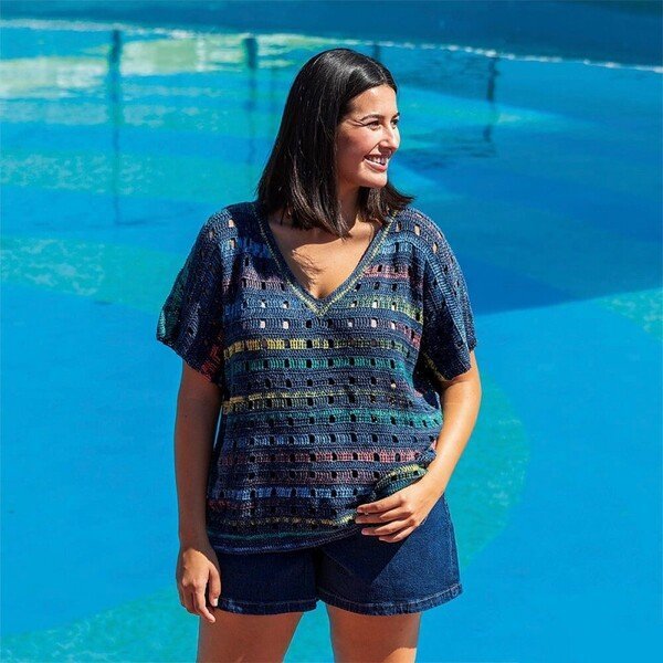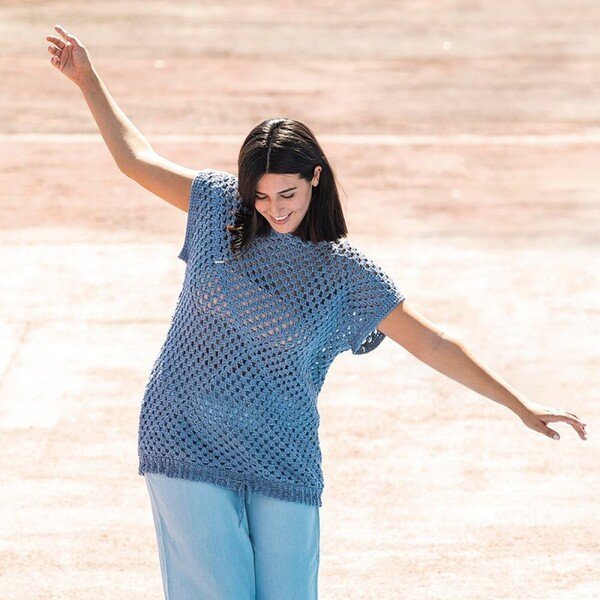 – 1 conjunto de top y pantalones - Entre los patrones incluidos encontrarás 9 modelos Katia Plus, con explicaciones para tejer en tallas que van desde M hasta XXXL.